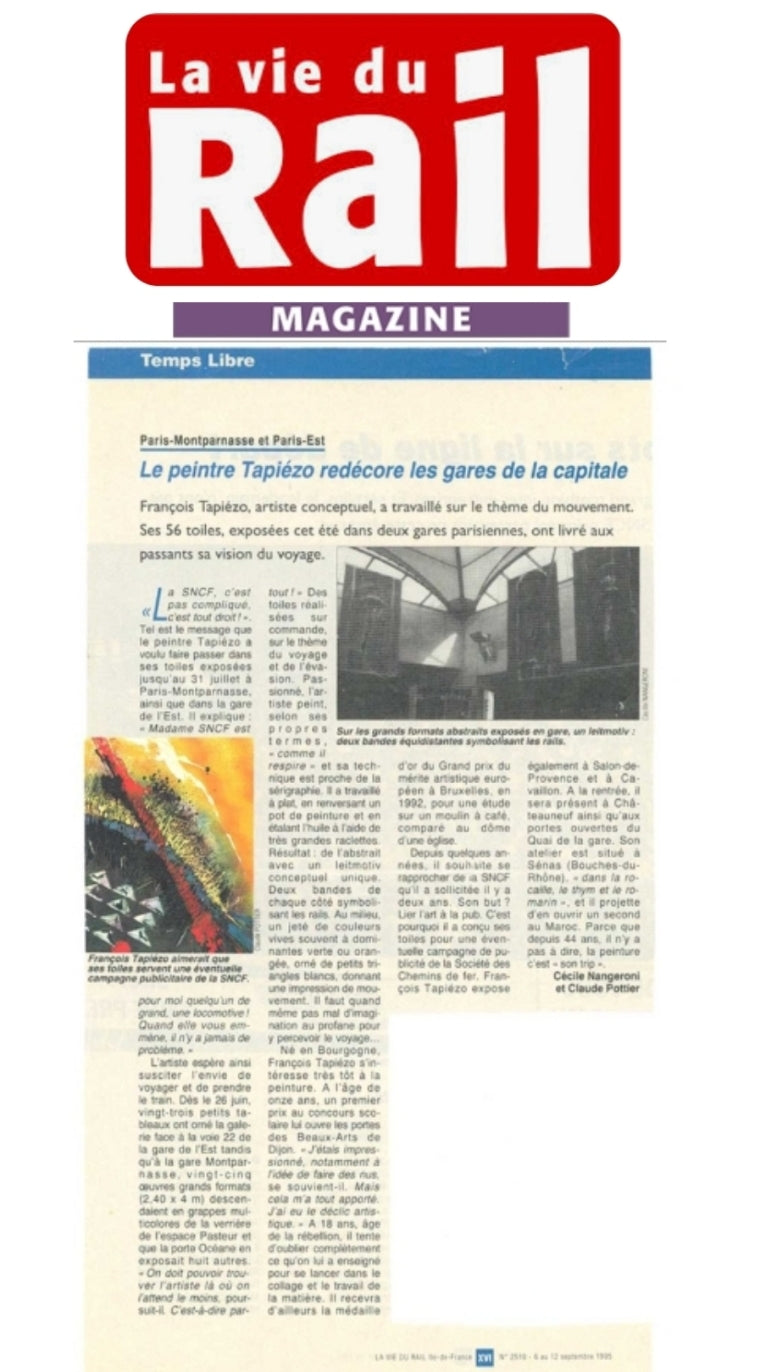 Tapiézo expone sus obras simultáneamente en tres estaciones de tren parisinas: Montparnasse y Pasteur-Vaugirard para los grandes formatos. ¡La Gare de l'Est es la elegida para los formatos más íntimos! Durante la instalación de los formatos de 4 x 2,40 m, Tapiézo se encuentra en una cesta a 8 m del suelo. En ese mismo momento, llega el periodista y fotógrafo de Le Parisien, Philippe Desprez. Para señalar su presencia, el periodista tiene que gritar. Se produce una conversación a gritos porque François Tapiézo no quiere salir. Tiene 25 obras para colgar bajo los techos de cristal de la estación, y el proceso avanza lentamente. « Estaba muy preocupado por la instalación... Al final, fue el agente de la SNCF quien me convenció de salir para la entrevista con el periódico Le Parisien».